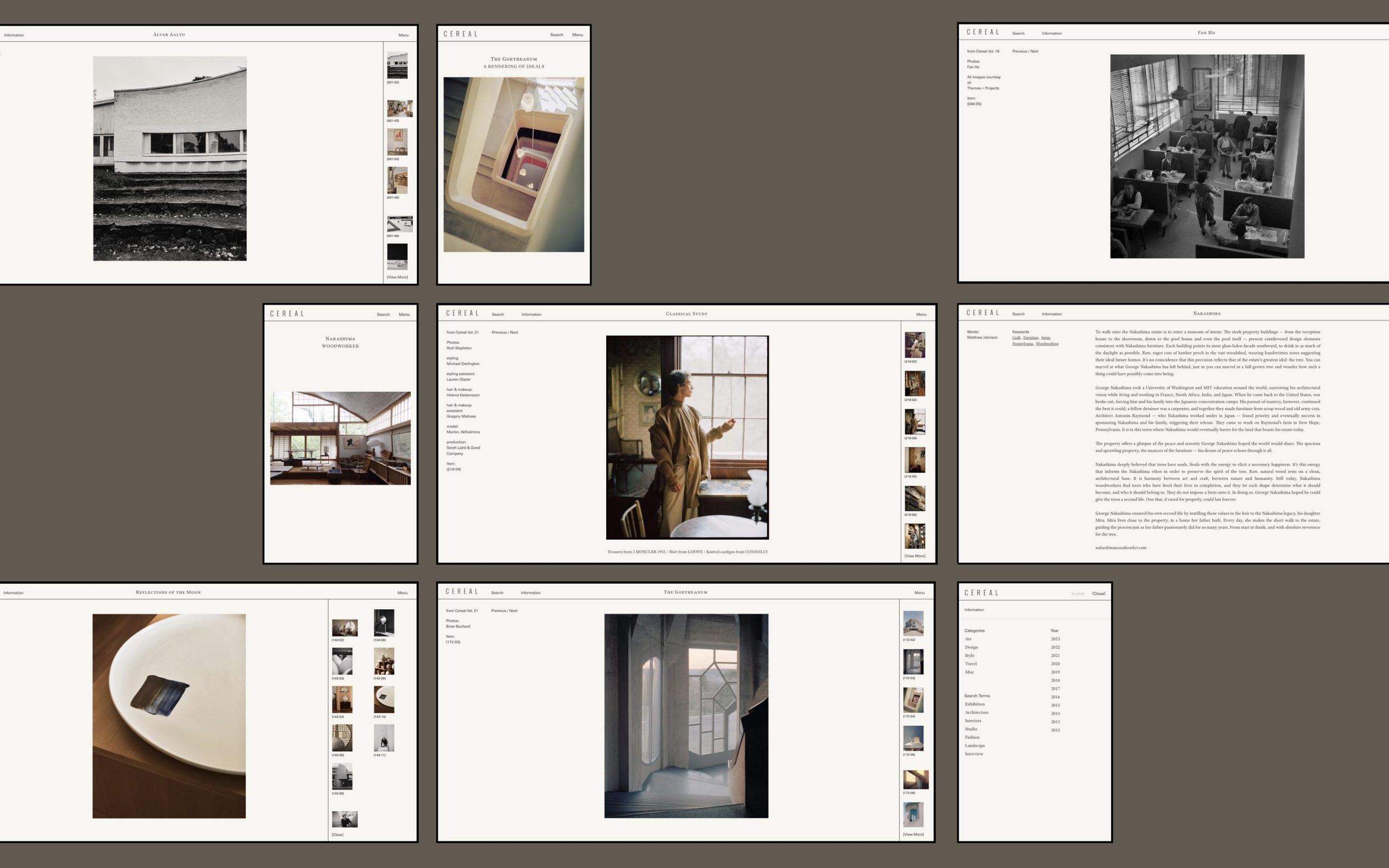 Our conversations with Rich Stapleton and Rosa Park started early on as we tried to brainstorm the functionality of the site and how it could be a living archive. This project was particularly important to us as it was the culmination of 10 years of work for Cereal. Having been both fans of the publication and also collaborators, we felt an added importance to create an online experience that did the magazine justice.